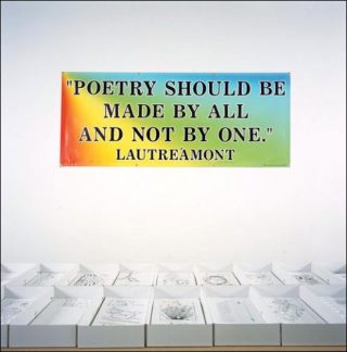 C’est dans la galerie que le visiteur est invité à composer à la fois le poème et son livre, en choisissant 5 feuilles parmi 22 liasses. Dans Free Poetry (2005), ce n’est pas juste la forme du livre qui est libérée, c’est le contenu du texte qui est constamment renouvelé. Le livre n’en finit pas, parce qu’il n’en a jamais déjà fini de commencer: paginations et machinations, machination dans la pagination.