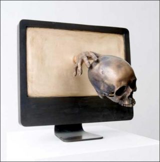 La sculpture en bronze — Haut relief 1 (crâne) — se compose d’une main qui nous offre un crâne surgissant d’un écran d’ordinateur. Avec cette référence explicite à une vanité de Caravage (ou de Frantz Halz, Le Jeune Homme au crâne notamment), Stéphane Pencréac’h s’empare, ici encore, d’une thématique surcodée par l’histoire de la peinture, et qui connaît aujourd’hui une nouvelle faveur (chez Damien Hirst par exemple). L’œuvre crève littéralement l’écran (de l’ordinateur Mac) dans une trouvaille plastique qui ne perd en rien de sa puissance métaphorique.