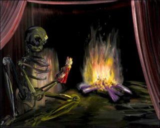 L’exposition se présente d’abord sous la forme d’un petit théâtre dévoilant derrière deux rideaux rouges un tableau de deux demi-crânes en plastique sur un fond noir opaque. C’est la première toile d’une pièce en quatre actes de quatre scènes (soit seize tableaux et bronzes, plus un en extérieur: Sifflements), qui donne le ton très «macabre» et pourtant tonifiant de cette exposition.
