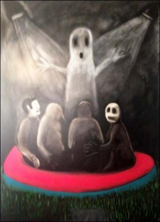 Extrayant ses figures d’un fond monochrome noir, l’artiste compose un jeu subtil, précisément réglé, entre les corps et la lumière qui les dévoile et les modèle. La lumière théâtrale fait aussi vibrer ces compositions statiques de moments clés. Il y a par exemple cette main posée sur un homme qui nous tourne le dos, une main que nous n’avions d’abord pas vu œuvrer dans l’ombre, trop occupés par un fantôme agitant les bras, revenant d’on ne sait quel ailleurs illusoire où l’herbe, dit-on, serait plus verte. Ces images mentales proches de l’apparition ont la persistance d’un rêve insondable.