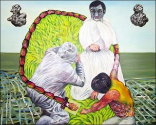 Les œuvres introspectives de Mohamed Ben Slama croisent l’histoire biographique et le fait de société. Leur style énigmatique et provocant repose sur une forme de silence, une expression contenue. Dans sa dernière série de tableaux, des groupes de personnages, mi-hommes mi-bêtes, embarquent sur de fragiles pneumatiques colorés dont on ne sait s’ils sont une bouée de sauvetage ou une piscine pour enfants. Le traitement des espaces dépourvu de profondeur apporte un trouble supplémentaire à ces récits de voyages immobiles dont on devine la portée allégorique.
