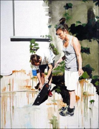 Or non seulement David Lefebvre opère-t-il cette «reproduction» par les seuls moyens de la peinture, mais encore a-t-il recours à des procédés plus classiques, comme la «mise au carreau» permettant de cadrer et d’agrandir le sujet à sa convenance. Ainsi, partant d’une image très pauvre, de basse définition, il ne cherche pas à masquer cet état mais à le préserver jusqu’au stade final du tableau terminé dont l’aspect «inachevé» montre le tracé au crayon de la grille sur la toile.
