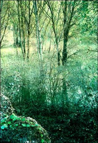 Dés l’entrée de la galerie, une image de bourrasque dans une haute futaie. Le mouvement dans les branches bouscule la composition, dissout le motif. Au centre de l’image, le flou se répand. Cette vibration du végétal nous rappelle Cézanne. Ce mouvement des masses anime le paysage. Quelque chose d’éphémère, d’instable, de fragile sous ces imposantes frondaisons se manifeste. Et déjà se décèle un certain intérêt pour ce qui se brouille, se désagrège, se délaye.