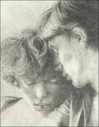 Certains dessins au crayon graphite, sans doute les plus évocateurs, dévoilent des amants qui s’embrassent. La force de ces dessins réside dans la suspension de l’instant où les lèvres de ces garçons vont se toucher lors du baiser : les lèvres s’approchent et se frôlent créant une scène où le désir prend forme. C’est l’instant douloureux et magique de réalisation du désir qui importe ici. Paul P donne à voir l’essence de l’érotisme, le moment où tout peut encore se passer.