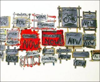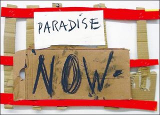 L’exposition de la Galerie Porte Avion propose un ensemble de travaux autour du titre «Paradise now»: grands tableaux d’après des intérieurs de monastères tibétains (monochrome noir ou orange), un grand dessin de «prosternations» à la craie orange sur rouleau de papier de 10 m de long, des écrits de couleurs vives: «Wisdom+compassion» «Paradise NOW» etc…comme des mantras ou prières.