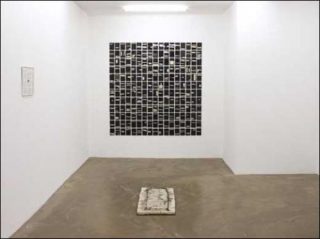 — Estefania Peñafiel-Loaiza, Sous rature #2, 2009. Suie, pages de livres, verre (204 éléments). 200 x 200 cm