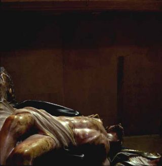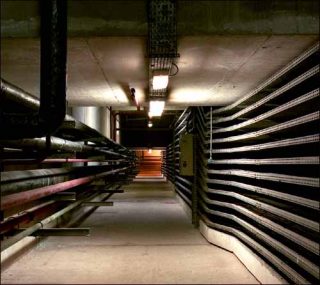 La confrontation entre les deux moments se joue à partir de la lumière également. Même diffuse, celle des chapelles et des églises laisse filtrer la clarté du jour. A l’inverse, les couloirs souterrains sont éclairés artificiellement. Encore une fois le dialogue entre le passé et le présent se fait à partir d’un vocabulaire formel très simple qui oppose le haut et le bas, la lumière naturelle à la lumière électrique.