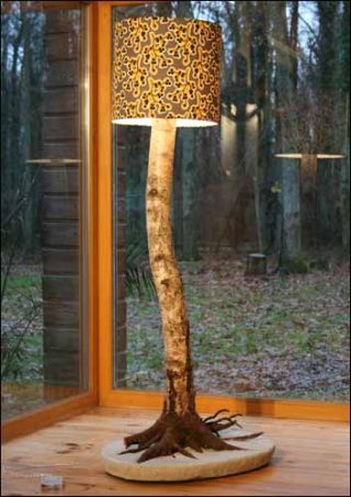 — Roots, lampe. Arbre fixé dans un socle en ciment, abat-jour recouvert de tissu, 2008.