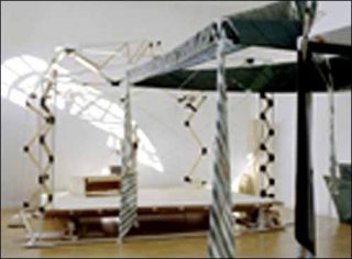 L’installation architecturale de Michael Beutler (Flamingo, 2004) est plus aboutie et plus complexe: quand un espace – volume vide et malléable – devient-il un lieu – un endroit avec son identité et ses repères? Cette structure ouverte en forme de parallélépipède approximatif occupe l’essentiel de la galerie et délimite un lieu précaire et fragile, tant à cause des matériaux qui la constituent (corde, plastique, bois, scotch) que par les liens qui les unissent (nÅ“uds, embouts de plastique). Rien n’est définitivement fixé ni vraiment symétrique. Les dimensions de cette installation sont d’ailleurs variables, selon l’endroit où elle est exposée: ici, elle est en partie disposée à l’extérieur de la galerie, comme une sorte d’auvent devant l’entrée. Ce bricolage n’a pourtant rien d’un inachèvement: en ébranlant les frontières du dedans et du dehors, du stable et du mouvant, c’est la fragilité transitoire de ce qu’habiter signifie que Michael Beutler saisit avec profondeur et beauté.