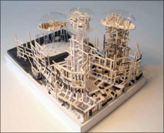 Partant de quelques éléments architecturaux qu’il commence par assembler entre eux (éléments souvent réalisés avant même de savoir comment ils seront intégrés à l’oeuvre), l’artiste construit ses maquettes de proche en proche, au gré des propositions de son imagination. Ainsi de fins piliers surmontés par une plate-forme seront prolongés par des échelles et des cloisons délicates définissant autant de cellules. Ailleurs une forme ressemblant à un radar, posée sur un polyèdre, appellera une démultiplication d’antennes et de récepteurs. Plus loin, une structure faite d’arceaux comparables à une colonne vertébrale stylisée se développe sur le mode de la courbe et de la contre-courbe.