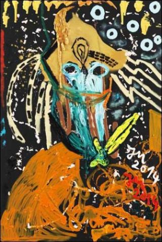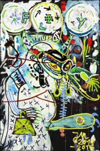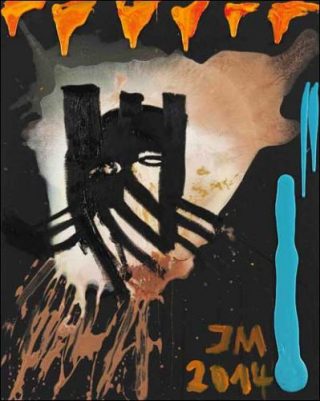 Né en 1970 à Tokyo, Jonathan Meese est allemand, et vit à Berlin. Il a développé une œuvre inclassable, entre expressionnisme et actionnisme, qui associe peinture, sculpture, installations et performance. Mêlant références historiques, légendaires, de science-fiction, sa mythologie personnelle convoque des personnages aussi variés que Fantomas, Maldoror ou Staline; autant d’avatars de l’identité de l’artiste. Dans l’exposition, il associe ainsi Parsifal avec Alex de Large, le héros ultra-violent de Orange mécanique (le roman éponyme d’Anthony Burgess et film de Stanley Kubrick).