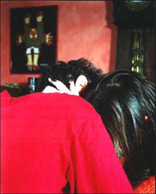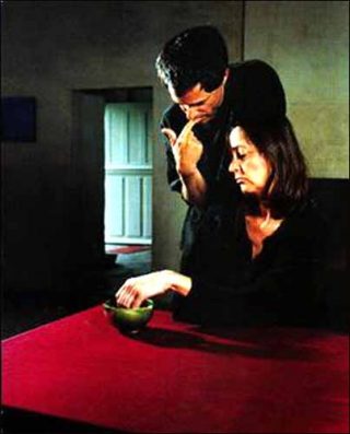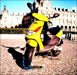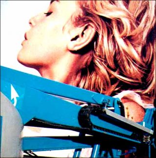 Une prise de vue réalisée au Grand Palais confronte ainsi une affiche publicitaire exhibant le profil sensuel d’une jeune femme avec une grue élévatrice. Le cadrage très serré focalise l’attention du spectateur sur cette mise en relation inédite, où les tensions internes à l’image apparaissent avec force. Un bras de la machine industrielle traverse verticalement le cou de la jeune fille, évoquant un couperet ou pourquoi pas aussi, une prothèse médicale située dans le prolongement de son bras.