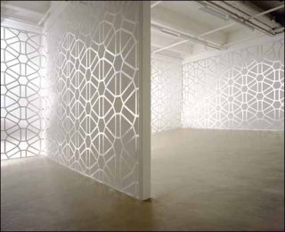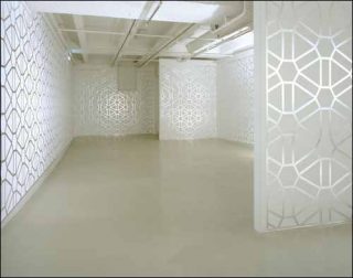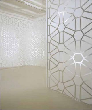 Ce réseau-résille épouse, sans s’y fondre, la structure des lieux. Il en souligne l’irrégularité: des bords plus épais distinguent les parois, des aplats de peinture grise comblent l’inclinaison du sol. La grille s’impose, et ouvre un espace circulatoire. En effet, le motif qui se répète à l’identique n’est jamais vraiment tout à fait le même. Réfléchissant, il apparaît, et disparaît, selon le point de vue. Ce qui incite au déplacement. Il renvoie aussi son image spectrale au spectateur. Au-delà du mur, c’est encore un espace virtuel qui s’ouvre.