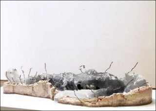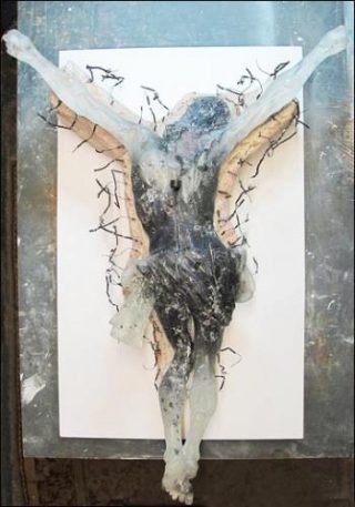 La dernière figure de Cristallisation montre un Christ amputé, véritable cul-de-jatte, homme-tronc, ou statuaire grecque brisée. Les jambes sont en effet coupées au-dessus du genou, le ventre est lacéré, les bras ont été cassés ou arrachés: Jésus gît, yeux clos, côtes saillantes, avec sa couronne. Mais à travers le corps démembré, on perçoit les différentes strates qui traduisent le procédé de fabrication employé par Pascal Convert. A l’intérieur de ce Christ gris, on perçoit des morceaux de charbon de bois enveloppés dans le verre. D’ailleurs, Reliques vient compléter notre Christ amputé. Ses membres sont présentés à part, et l’on remarque encore à l’intérieur de leur structure des bouts de bois carbonisés, comme s’il s’agissait des os du corps humain.