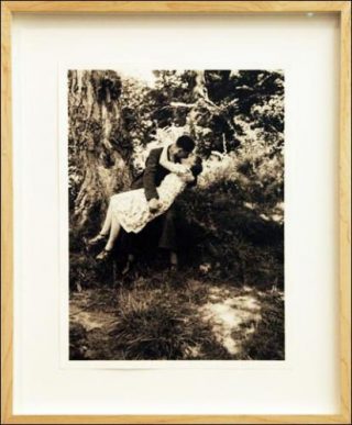 Les livres de verre et les membres du Christ se trouvent disposés autour d’une figure de madone sculptée dans un bloc de verre extrêmement massif. Pourtant, malgré l’épaisseur du verre, la sculpture donne l’impression qu’elle peut vaciller à tout moment, comme une flamme ou comme une larme. Elle représente d’ailleurs un visage en proie aux tourments, bouche ouverte, yeux suppliants, comme si la madone était en pleine prière ou se lamentait. Derrière elle, la photographie Eté 1939 apporte un contrepoint plus léger et poétique, avec un couple en pleine étreinte exprimant toute l’ardeur de la passion amoureuse.