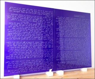 Enfin, Treblinka nous replonge dans les épisodes tragiques de l’Histoire, en ravivant la mémoire des juifs déportés en Pologne entre 1942 et 1944. Cette œuvre reproduit quatre double-pages issues de carnets écrits en yiddish rapportant les souffrances et les traitements infligés à ces populations. Ici, les mots ont été gravés au laser dans du verre bleu cobalt.