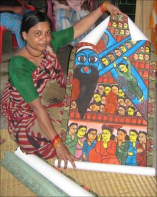 En bengali comme en sanscrit, patachitra signifie «peinture sur étoffe». Tradition populaire née au VIIIe siècle de notre ère, on la rencontre aujourd’hui encore dans le district de Medinipur, à l’ouest de Calcutta. Art modeste et pourtant merveilleux, il est le fait de conteurs ambulants qui peignent sur des rouleaux de toile les thèmes et figures qu’ils chantent pour les passants, dans les rues et sur les places des villages. La conteuse ou le conteur déroule la toile d’une main et, de l’autre, indique à l’assistance le personnage, le fait ou le lieu mentionné dans son récit chanté, le pater-gaan.