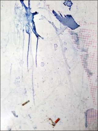 Pour «Patch», Jo-ey Tang présente un triptyque reposant sur ses œuvres précédentes, Documents from Like An Intruder, The Speaker Removes His Cap (2014). Des feuilles de plastique adhésif ont permis de fixer tels quels les mégots de cigarettes abandonnés par les visiteurs lors de son exposition individuelle «Like An Intruder, the Speaker Removes his Cap», à la galerie Joseph Tang (Paris, 2014). Ces feuilles ont ensuite été imprégnées de gouttes de thé — un thé aux fleurs de pois papillon acheté par l’artiste sur l’Île de Ko Chang (Thaïlande).