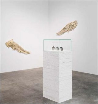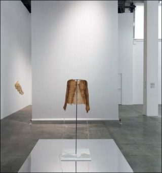 La sélection des œuvres qui sont présentées dans l’exposition suggère ce dialogue périlleux avec les matières et la mémoire du monde: une armure de samouraï en cristal et une camisole de force en ailes d’abeille réalisées pour l’exposition, une colonne de verre avec noir de fumée, des pattes d’oiseau en métal, des iris mourants à l’aquarelle, un Christ mort sur papier carbonisé, des vitrines enfumées par la mémoire du Jardin des délices de Jérôme Bosch…
