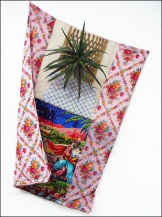 Convoqués à titre d’anti-modèles picturaux, les tapisseries décoratives, fourrures synthétiques, drapeaux, découpes de Balatum imitation marbre, luminaires, peintures de genres bon marché ou les panoplies de déguisement d’enfants jouent à visage découvert le jeu de l’illusion. Choisis et assemblés en fonction de propriétés formelles objectives, comme la couleur, le motif, le matériau, ou l’échelle, ces objets sont ensuite soumis à une série d’opérations de marquages, comme le découpage, le pli, l’encadrement, la suture, le rapiéçage, le recouvrement.