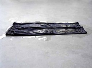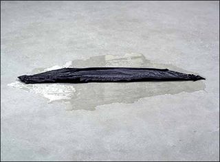 Les Pantalons sont mis à plat sur le sol, imbibés d’une eau luisante: gorgés, ils prennent alors des formes froissées, comme s’ils portaient l’empreinte d’un corps disparu. Sculptés par l’humidité, ces vêtements abandonnés sont livrés à l’improbable puissance formelle de leur matière.
