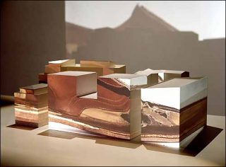 Pied, visage, coupe de chaussure ont été photographiés, puis projetés en diapositive sur des volumes relativement simples, bien souvent des éléments d’architecture. L’image du corps est constituée de seuls rayons lumineux, mais les formes sur lesquelles elles se déploient ne sont pas de simples écrans. Elles imposent leur volume propre à l’image qu’elles diffusent, la sculptant de manière indirecte.