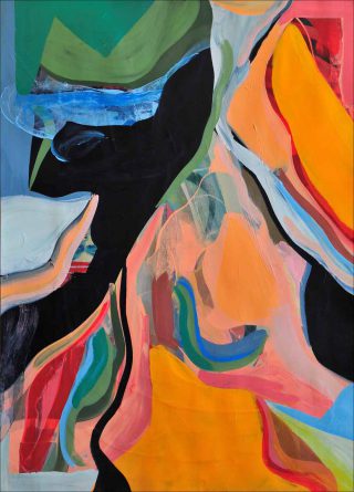 Des couleurs organiques, roses, noirs, rouges, très plans, mêlés sans motifs, et pourrait-on croire sans autre intentionnalité que celle de ces masses de peinture juxtaposées, semblent se mouvoir dans un très lent flottement, qui n’est pas sans rappeler celui de la sédimentation.