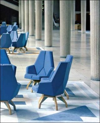 Pierre Paulin exécute en 1986-1987 une commande du Ministère de la Culture/Mobilier national pour l’aménagement de la grande salle hypostyle du Palais d’Iéna construit par Auguste Perret en 1939, où siège le Conseil Economique et Social. Au sein de l’immense salle à colonnades, les tapis « Jardin à la française » définissent 8 espaces intimes de conversation composés de tables basses en bois de sycomore, érable moucheté et aluminium (n’existant jusqu’à présent que sous la forme de dessin) et de fauteuils facettés en bois de sycomore, aluminium et mousse. Les lignes géométriques font écho aux plafonds à caissons, s’inscrivant discrètement dans l’architecture des lieux, imposante et majestueuse.