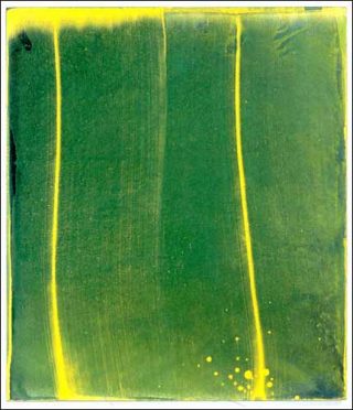 La grille explose littéralement avec Sans titre 2001 de Marthe Wéry, sorte de grand monochrome vert d’où émergent des flaques de peinture. Cette dernière toile est comme l’antithèse de la Peinture raté 2 de Mitja Tusek où les coulures composent des paysages obscurs. Entre les deux œuvres s’instaure un étrange dialogue.