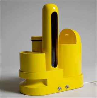 ― Lampe de table Rimorchiatore, 1969. 38 x 30 x 15 cm. Métal moulé émaillé jaune, verre. Editeur : Candle, Italie