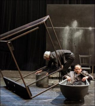 Ils déambulent sur scène comme à la recherche de leur espace, de leur équilibre, un équilibre bousculé par une force d’attraction dirigée autant vers eux que vers la scène faisant de leurs corps, un élément comprimé, ramassé essayant de s’étendre. Josef Nadj continue sa recherche artistique dans une élaboration, une fécondation des corps sur scène. Ce sont deux danseurs qui, déjà apprivoisés l’un par rapport à l’autre, investissent l’espace pour le découvrir. C’est aussi l’éveil de corps voulant prendre conscience d’eux-mêmes. A tâtons, les danseurs prennent possession de l’espace par des mouvements sans grâce ni fluidité.