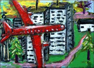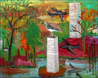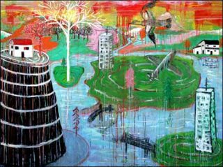 Des avions, des tours, des oiseaux, des maisons, des arbres occupent les tableaux-paysages d’Eric Corne. A la fois peintre, curator, professeur et anciennement directeur du Plateau à Paris, cet artiste aux multiples talents peint le chaos du monde contemporain. Ses couleurs vives et ses motifs obsessionnels font écho au sentiment d’insécurité qu’entretiennent les médias en diffusant leur lot quotien d’attentats, de destructions, de pollution. Telle une obsession, cette atmosphère et ces menaces de catastrophes se retrouvent partout: un bateau en naufrage, une forêt en feu, une ville détruite. Même les paysages d’apparence calme sont traversés par une tension est sous-jacente: ciel trop rouge, traits violents, disproportion… l’équilibre ne devrait pas tarder à être perturbé.