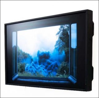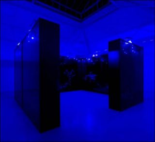 L’azur cède le pas à la nuit. La chaleur des résistances s’évanouit au profit d’une atmosphère qui se fait fraîche, humide. On perçoit le bruissement d’un ruisseau invisible et le clapotis de quelques gouttelettes dégoulinant çà et là . L’abstraction des monochromes d’Azur est remplacée par une installation de verre futuriste, qui se parcourt comme un paysage nocturne, surnaturel, comme un jardin botanique aux effluves enivrantes.