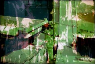 La superposition de deux images, l’une, imprimée sur verre (une photo trouvée représentant une vue d’extérieur), l’autre sur papier (une photo construite dans l’atelier à partir de matériaux de récupération) produit un effet d’étrangeté et une mise en volume du tableau photographique.