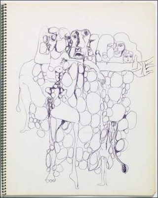 Dans les dessins de cette série, on retrouve tout le répertoire iconographique d’Alina Szapocznikow: des tumeurs se mêlant à des vagins, des lèvres posées sur des jambes désarticulées, des yeux émergeant à l’horizon, une femme alanguie sur un phallus. Elle y exacerbe le climat onirique de ses «Paysages humains» en rehaussant ses dessins d’aquarelle fortement diluée, dans les tons vert, rose, gris et bleu, évoquant ainsi les atmosphères étranges du surréalisme. Les formes organiques et sculpturales, les expérimentations techniques donnent naissance à des œuvres extrêmement graphiques. Par ailleurs, à travers les nombreuses touches de couleur rose qui, dans ses «Paysages humains», rendent la chair palpable, une tension érotique transparaît.