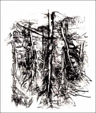 Exécutées sur papier chinois encadré sous verre, ces eaux-fortes sont marquées de leur auteur en ceci que le retournement du sujet, opéré comme dans ses peintures selon une verticalité radicale, n’en met que davantage en évidence l’extrême stabilité d’une composition que l’on dirait enracinée — terme certes peu vain s’agissant de Baselitz né en 1938 à Deutschbaselitz. Mais dans les Baüme où le support apparaît sous l’arbre, la légèreté du tracé et la transparence du motif évoquent plus le dessin d’un Corot qu’ils ne le doivent au trait noir de la gravure sur bois d’où est issu l’épais cerne expressionniste. Est-ce alors là la raison du paysage écrit sous le paysage tracé ? L’arbre retourné depuis sa cime ou dont les frondaisons renversées font rideau est sans équivoque dans son format vertical. Pour autant, il semble en même temps répondre à l’ordre d’une graphie dont il ne transcrirait, d’une œuvre à l’autre, qu’une seule unité de signes à la fois.