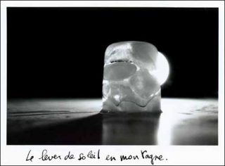 Avec la série des « Paysages romantiques », Joachim Mogarra propose une version étonnante et décalée des lieux et thèmes pittoresques de cette période de l’histoire de l’art : montagne, grotte, voyageur solitaire apparaissent, sujets isolés sur un fond noir ou baignés dans une ambiance lumineuse vaporeuse. Mais la montagne est un glaçon éclairé à la lampe de poche, la grotte, un bouchon de liège creusé au milieu, et le voyageur, un simple jouet !