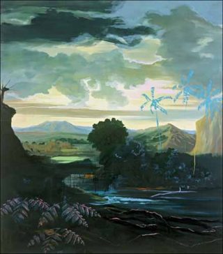 Avec «Pêcher l’eau», il dévie du chemin strict de la figuration pour flirter, quoique timidement, avec l’abstraction. Ses œuvres récentes se divisent clairement en deux catégories. Les premières ramènent une partie du paysage au premier plan et fondent ses détails en rubans parallèles aux couleurs électriques, tandis que le second plan du tableau reste parfaitement réaliste. L’oeil hypnotisé se noie dans les vibrations de ces bandes dont la nature véritable reste inexpliquée. Ciel et terre tendent à se confondre, à s’inverser, à fusionner. A tel point que les toiles pourraient presque être regardées à l’envers.