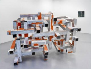 La sculpture monumentale A Lifetime propose une version déconstruite des «Compounds». Les éléments en aluminium ne sont plus superposés régulièrement afin de former une masse compacte, mais additionnés de manière anarchique. Il s’en dégage un jeu de forces dynamiques entre les vides et les pleins; jeu encore accru par les ajouts de peinture orange venant souligner ponctuellement certaines lignes de la sculpture.