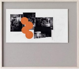 A l’étage Les Oranges lui font écho. Sur une peinture claire et épaisse, une photographie noir et blanc en quatre exemplaires est collée horizontalement et verticalement, à l’endroit et à l’envers, dans différentes positions. L’image montre le temps de construction de A Lifetime et les assistants s’affairer dans l’atelier. Le rappel à la sculpture est fait par quatre ronds orange enchevêtrés, tel un totem graphique. Pedro Cabrita Reis souligne là l’importance du temps de la réalisation, et lui rend hommage alors que la tentation est grande de n’apprécier que l’Å“uvre achevée.