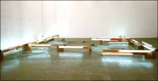 Au premier étage, on pourra découvrir une autre installation faisant courir sur le sol des fils électriques reliés à des poutres et des briques sur lesquelles s’accrochent des tubes néon : A propos des lieux d’origine #1. Ici, les constructions se font paysage définissant de multiples frontières et un chemin de circulation emprunté par les fils.