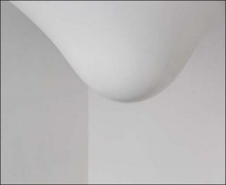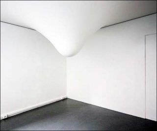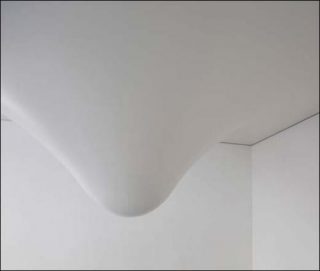 Le régime le plus fréquent par lequel nous nous rapportons en général à l’art est d’abord visuel, puis focalisateur. Pegar n’échappe pas à ces deux caractéristiques. Même si la goutte, blanche sur un fond blanc, peut sembler invisible de l’extérieur de la galerie (bien des passants ne la voient pas à travers la vitrine), sa présence, centrée dans l’espace, devient immanquable lorsqu’on se trouve à l’intérieur. Cependant, une fois que le regard a glissé sur cette torpille optique (la forme entre dans l’oeil sur-le-champ), celle-ci produit d’autres effets. Sa blancheur impeccable, presque trop propre (6), contraste fortement avec les irrégularités de ce white cube qu’est la galerie. Pegar fonctionne alors à rebours des oeuvres d’art communes. Peinture ou sculpture (pour n’en rester qu’à ce registre limité), l’oeuvre contemporaine est souvent une sorte d’objet dont l’aspect fait-main tranche avec cette machine supposée neutre, destinée à produire de l’art, qu’est le white cube. Ici, c’est l’inverse qui se produit. Le caractère lisse de la sculpture attire l’attention sur les défauts du contenant architectural dans lequel elle se loge – ce qui était moins le cas de l’oeuvre conçue pour une exposition à Chelles selon la même technique du plafond tendu déformé. (7) Le plafond est, par exemple, aussi plan que possible et révèle l’inclinaison du linteau au-dessus de la vitrine. Enfin, il faut noter que si Pegar incite les visiteurs à porter leur attention sur l’architecture du lieu, elle leur propose aussi, en quelque manière, de s’examiner eux-mêmes. Comme elle descend d’environ 140 cm du plafond – et étant donnée la superficie de l’espace, réduite par l’artiste – la sculpture empêche généralement de voir les têtes des autres visiteurs. Elle peut engendrer alors un déplacement pour voir l’autre ou les autres. Comme dans une ronde, une chorégraphie inattendue qui est une nouvelle forme, ni « écrite », ni prescrite, ajoutée à celle que propose l’oeuvre.