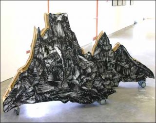 Là aussi, par une sorte de paradoxe puisque a priori le dessin est plus « léger » que le volume ou la sculpture, tu inverses le rapport à la densité, à la gravité, dans les deux sens du terme. Tu fais un dessin extrêmement chargé, lourd, dense et tu le poses sur une forme évidée, mouvante, légère, qu’on peut manipuler.