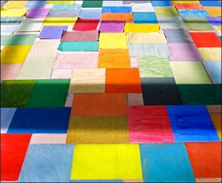 « La peinture peut alors, enfin, trouver sa stabilité provisoire, l’apaisement d’une stase, dans ces murs de tissus suspendus sur un fil, qui s’inscrivent et s’exposent dans le « cadre » de ce dispositif. Ce cadre, pourtant, ne produit pas l’effet attendu du cadre d’un tableau traditionnel. Parce que les rectangles de couleur, tous identiques, sur lesquels se déploie le jeu de la réserve et de la tache, fragmentent ou fissurent l’espace qu’animent les couleurs. Parce que ces rectangles sur leur fil exposent la peinture comme objectivement suspendue. Ici, la peinture puise à la présence de l’objet, lors même qu’il lui offre le cadre de son décadrage: la peinture ne perd rien ici de sa fragilité ni de sa ténuité puisqu’elle paraît « tenir à un fil ». »