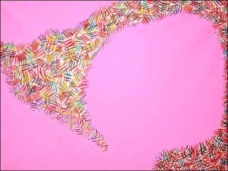 Les formes, frontales, parallèles au plan du tableau, émergent, sans origine, ou y semblent menacées d’absorption. Ou encore, provenant d’un hors champ insaisissable, elles s’effilochent sur la toile, créant une illusion de profondeur. Elles se superposent, tels des mikados multicolores savamment aimantés.