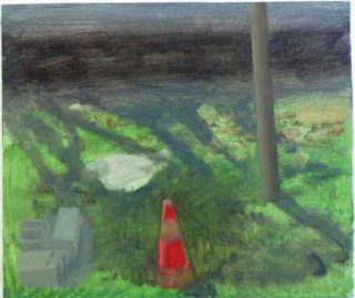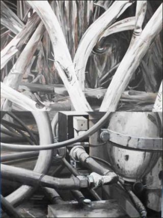 Son réalisme pointilleux succède aux taches et au geste, la densité des rendus est au service de diptyques puissants qui réunissent des univers dissonants en un tout aux apparences trompeuses: cartouchière/barres d’acier, parpaings/écorces… Il joue de la mixité des univers dans la construction de contraires et témoigne peut-être ainsi de l’évolution des choses, d’un monde qui se construit en silence.