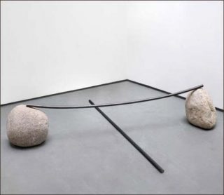 Ainsi, Lee Ufan questionne notre rapport au temps, à la matière, situe son Å“uvre au cÅ“ur de la dichotomie temps naturel-temps artificiel. Dans l’espace central de l’exposition, les sculptures dialoguent avec les toiles blanches. On est au centre de ce mouvement entre la pesanteur des matériaux des sculptures et la légèreté des toiles.