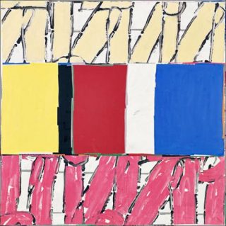 — les «signes», comme il les appelle, qui peuvent se substituer aux coups de pinceau, et occupent géographiquement une place importante dans chacune des toiles. Ces signes sont inlassablement redéfinis: leurs variations de taille, sur fonds clairs où colorés, en «claustras», ou entourés d’aplats de couleurs confrontées, rythment l’œuvre, et donnent un pouvoir unique à chaque tableau.