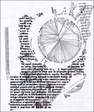 Son processus de création est centré sur le texte. Il passe ses journées dans des bibliothèques, sélectionne avec minutie des pages, inspiré autant par le fond que par les formes qui se dégagent des phrases. Il les photocopie puis intervient dessus en griffonnant les lettres, dans lesquelles il recherche des formes d’amibes qu’il nomme pseudopodes, puis dessine ou colle les images que le mouvement du texte lui suggère.