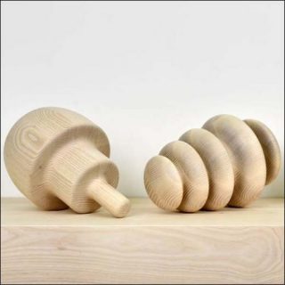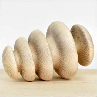 La série des Shapes Spinoffs compte plusieurs centaines de petites sculptures en bois de frêne réalisées à l’aide d’un tour à bois, une technique traditionnelle d’ébénisterie.
